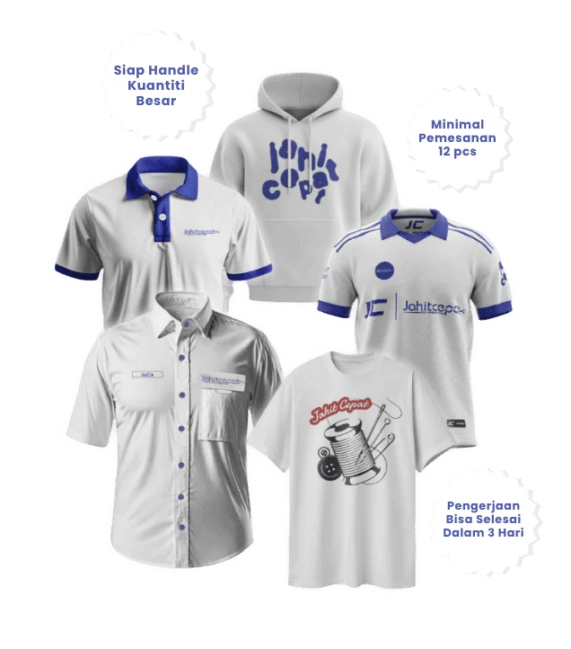 JahitCepat adalah mitra konveksi terpercaya yang siap memenuhi kebutuhan seragam kerja perusahaan Anda dengan kualitas unggulan. Kami melayani pembuatan berbagai jenis pakaian kerja seperti kaos, polo shirt, kemeja, PDH/PDL, jaket, varsity, hingga denim, yang dapat disesuaikan dengan desain dan identitas perusahaan Anda. Dengan komitmen terhadap kualitas dan ketepatan waktu, JahitCepat siap membantu perusahaan Anda tampil lebih profesional dan percaya diri melalui seragam yang dirancang khusus sesuai kebutuhan klien kami, baik itu Bordir dan Sablon.